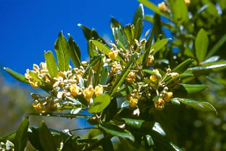 Yellow, fragrant flowers with a reddish-streaked throat and a scarlet blotch inside hang in clusters at branch tips or in leaf axils from October to May. They are noticeably unusual in that they are globular or bell-shaped with the lower corolla lip inflated to form a deep pouch and the upper two-lobed corolla lip held erect.