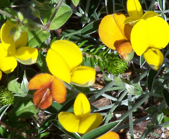 At first glance it looks as if there are two similar kinds of plant growing together. This is because most of the flowers are bright yellow and others are a rich russet. Closer inspection reveals that they are all growing on the same sprawling groundcover. The green leaflets appear to be edged with silver.