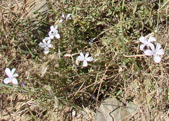 Inflorescence: Flowers 1 to 3 clustered in the leaf axils. The corolla (petals of the flower) is 2-lipped. The upper lip is 4-lobed and the lower lip entire, lobes deeply divided. Flowers pale mauve to white with a few dark mauve streaks.