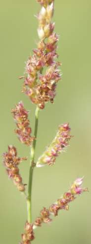 Brachiaria serrata is a perennial grass with bright green leaves and red or purplish red spikelets covered in silky hairs.